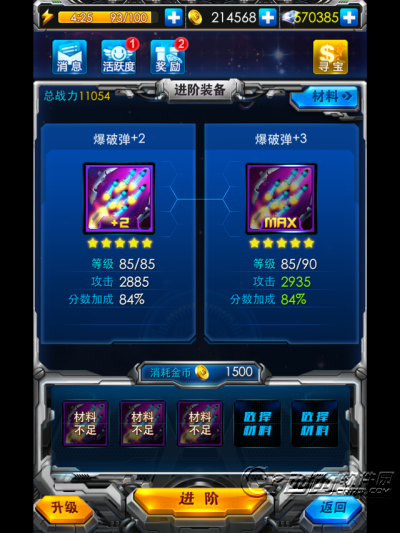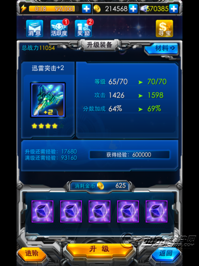 升级:在仓库界面点击强化,首先会来到升级界面,上面选择想要升级的装备,下面选择升级所消耗的资源。提升装备的等级,同时提升了装备的属性。