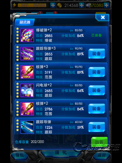 副武器:玩家的辅助武器,不同的攻击类型可以应对不同的场合。根据战机类型,玩家可以选择相应的副武器来弥补主武器的缺陷。例如:“暗灭幻影”是一架单轨道激光炮战机,这样就使得其攻击范围遭到了严重的限制,这时只要选择一件可以提升攻击范围的副武器便可使整架战机具有应对多因素条件的能力。