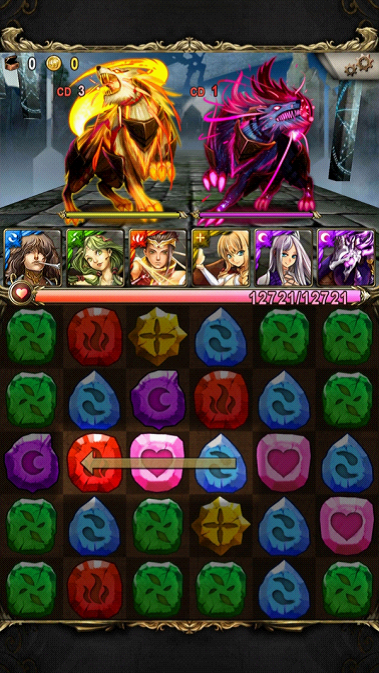 战斗画面的下方很大一片区域玩家看见的是一块块的符石,只要组合三颗或者以上同色的符石,我方就会发动攻击,而符石的移动是根据玩家手指滑动的方向来决定的,特别有意思的是,这不是一款简单的消除游戏,符石间互相的移动,会影响全局的走位,高手不单单会盯着附近的符石消除效果,经常会出现移动一刻,全屏消除的震撼场面,当然这个路线是需要精心策划的,并且还有时间限制,所以非常困难。