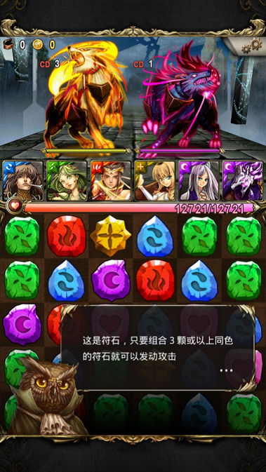 另外队员的主动技能也是非常有用的功能,点击头像发动之后会有非常华丽的效果,并且根据卡牌种类的不同,主动技能也会有所区别,有输出伤害的以及辅助回复的等等,掌握了这些符石的运行方法,教程中剩下的部分就留给玩家自己体验了,不过提醒一下这场战斗是必败的。