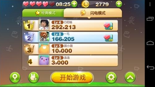 1、从微信或者是手机qq登录到游戏后,选择闪电模式,可以看到本模式的好友排行榜,点击下方的开始按钮即可进行游戏。