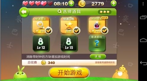 天天星连萌中的道具也和经典模式的一样,不过闪电模式抛弃了炸弹,变成了五角星,玩家右上角的进度满了之后,就会获得许多
