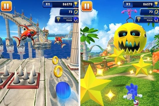 这款手游的玩法比较简单,和同类型的跑酷游戏相类似,玩家只需用手指触控向前奔跑的索尼克,切换跑道并跳跃或翻滚躲避障碍物,并在过程中打败敌人保持血量,最终抵达关卡的终点即可获胜。此外,随着游戏的进程,索尼克的小伙伴们也会陆续登场,双尾小狐狸塔尔斯、索尼克的女朋友粉色小刺猬艾米・罗斯都会让玩家体会到不同的操控感受。