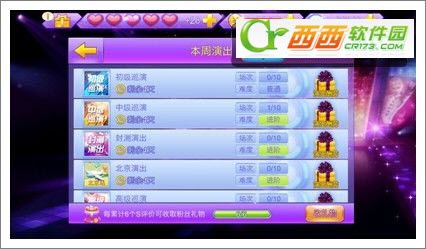 说了游戏玩法后,接着我们来了解一下游戏模式吧,《全民炫舞》游戏模式分为“全国巡演”和“本周演出”。在全国巡演中我们要从北京站出发开始全国巡演之路,每一站我们需要按要求挑战五首歌,挑战成功后方可进入下一站继续巡演。而本周巡演作为类似限时副本形式的系统,你可以额外选择一些特殊要求难度的关卡,体验更刺激的挑战。