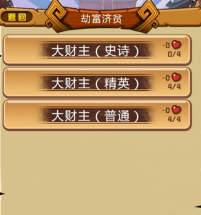 通过出征界面选择劫富济贫,就可以开始劫富济贫了,这里共有三种难度,分别是普通,精英,以及史诗,对应不同级别的战斗,其中普通难度自然是最简单的,玩家在初期的时候就可以挑战成功,至于精英难度,大概到30级左右,一般也就具备了足够的战力,史诗难度作为最高级的难度,对于战力的需求是极高的。