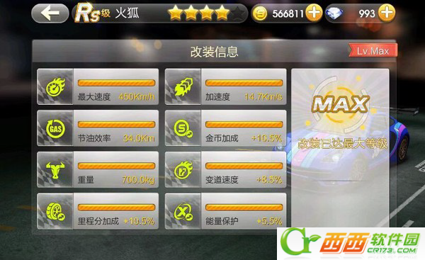 属性:最大速度450Km/h、加速度14.7Km/s、节油效率34.0Km、金币加成+10.5%、重量700kg、变道速度8.5%、里程分加成+10.5%、能量保护+5.5%;