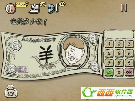 技巧:把手机或平板屏幕翻转180度即可看到纸币的面值,如下图所示。然后在右边的计算器中输入“216”,点击“ok”即可过关。