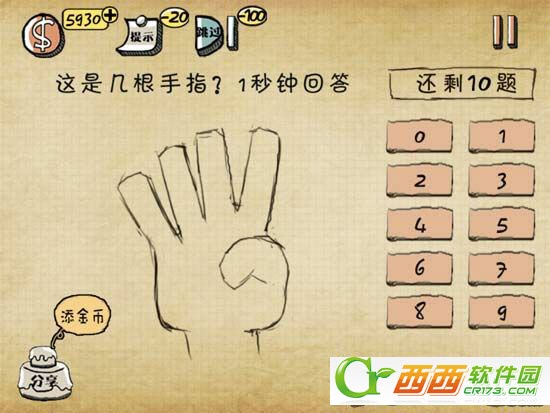 技巧:按照手指的个数,在右边点击对应的按钮(1秒内完成)。注意倒数第2题是在6~9之间的数字,小编尝试了很多遍才过的。