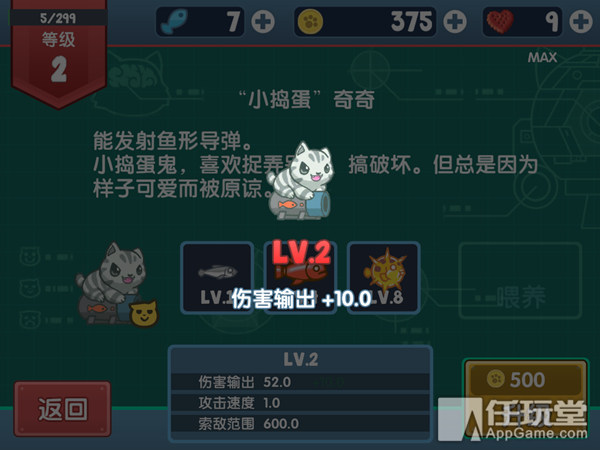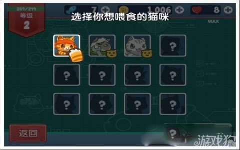 保家卫国虽重要,身体才是革命的本钱。游戏中玩家需要经常到猫屋查看喵星人的情绪状态和饥饿情况,如果看到喵星人变脸了,玩家需要消耗一定的金币给喵星人喂食,否则会影响它们的战斗热情的。