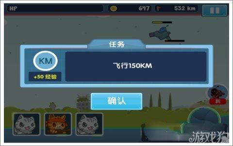 戏中玩家需要的就是带领可爱的喵星人突破敌人的包围杀出一条血路来,只有走的更远才能看到喵星球的未来。玩家玩一局游戏会消耗一个爱心饼干,每一局都会有一个对应的任务需要完成,游戏也会计算每局飞行的距离,只有通过完成本关卡任务才能够解锁相应的喵星人、船坞和道具进入下一关卡。