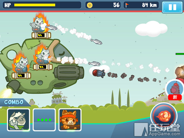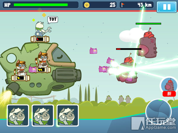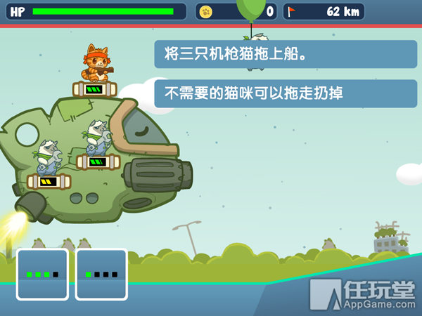 战斗时屏幕左下角会有几个方格,用手指按住方格里的猫猫往飞船上拖,就能让小猫们进入战斗状态。不要以为每个岗位都安排好小猫就可以高枕无忧了,小猫也是会累的。每个小猫下方都有一个体力的消耗情况显示,如果体力全部消耗完毕,小猫就会掉下飞船,需要玩家看准时机,将方格内更新的小猫及时补充上去。