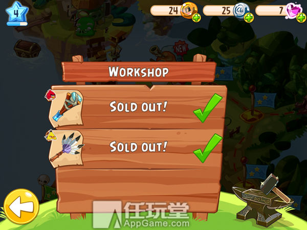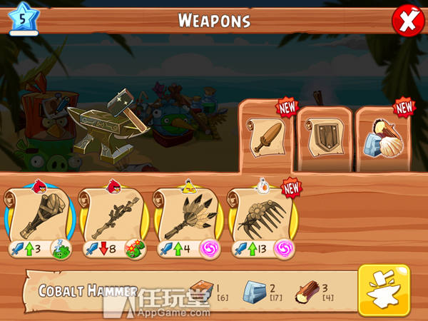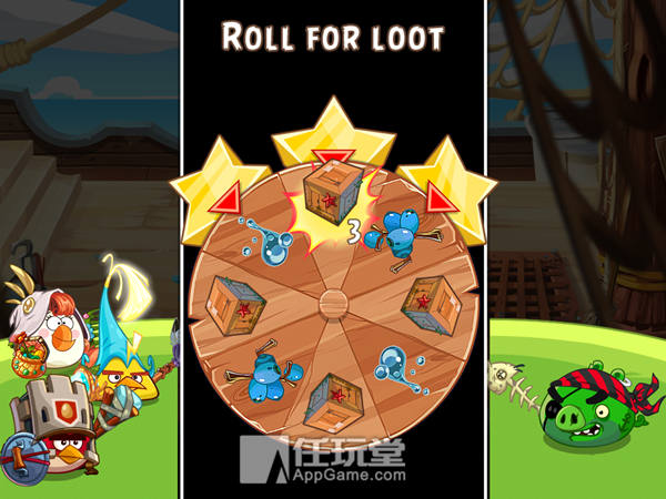 提到RPG游戏,总免不了打造武器、升级装备这些元素,这款“史诗级”游戏又怎么会少呢?随着关卡的不同,在战斗中获得不同的器械及基础材料用以打造武器装备。材料获得多少,完全就看战斗结束后的等级评价。等级评分总分三星,是以战斗胜利后各小鸟们的血量为依据的。血越多,评出三星的可能性也就越大。战斗结束后会出现一个“抽奖”大转盘,每一格中的材料数量只有1,其中华丽丽的一格是数量为3的“大奖”。所得的星级评价会点亮转盘指针,所以星星越多,得到的材料数量也多,并且抽到“大奖”的概率也高。牺牲一名队员,三星直接拜拜,团灭啥都捞不到,不仅被绿猪嘲笑,还只能拿到那么一丁点赏钱。