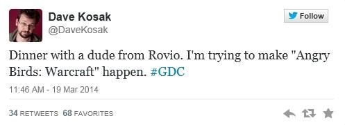 Dave是在GDC上跟来自Rovio的人一起吃过饭后写下了这条微博,当然这也有可能只是一句玩笑。