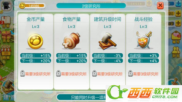 研究所优先升级金币产量和肉产量,也就是下面图片的前2项(需要金币研究,数额大)。。后两个建筑缩减时间和战斗经验先不升,后期有钱再升。