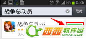 第二步【下载安装游戏】:在手机上打开应用宝界面,输入“战争总动员”这几个字,即可搜索到(若在第一页未发现,可下拉翻页找到游戏),点击下图中的“下载”按钮,下载安装即可。