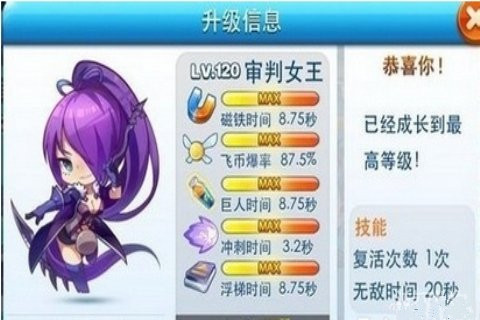 首先先说说审判女王吧,审判女王也的比较少出来的角色,因为只有2种途径能请她出场一种是积分兑换29888这么多分一般肯定是兑换不了的,其次就抽奖,这个概率也不是很多,所以审判女王还是属于稀少品种,她的满等级是120级,也算是到角色等级的巅峰了,技能还比较不错可以免费复活一次,复活这个技能刀到那个游戏里面都是十分重要的吧,另外还有无敌的20秒时间,多少难关微微一笑就给过了啊,个人觉得审判女王的综合属性还是不错的。