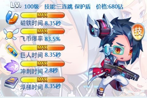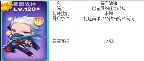 首先我们先来看看蒙面战神的有关资料,因为蒙面战神还没有登录,小编我只能做一个大概的预测,首先蒙面战神的最高等级是120级和现在顶级角色的等级是相同的,其次就是价格格外吓人,就算升级到满级应该是要花费1200钻石左右也就是说蒙面战神1级都可以值3000个钻石,这可以说是天天酷跑里面最贵的角色了吧,属性应该会极其变态。
