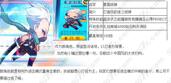 下图为蒙面骑士的外观和属性,蒙面骑士的特殊技能为能撞破一切障碍物,且获得Perect成绩。