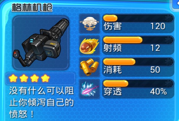 优势:每分钟12000发,打出的子弹可形成子弹风暴,切断一切。