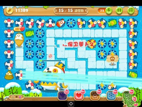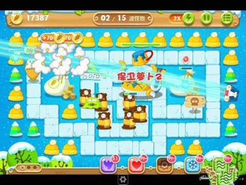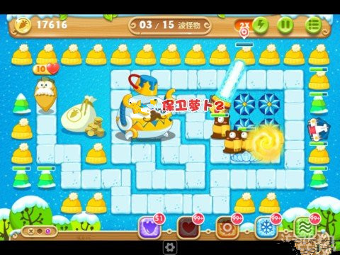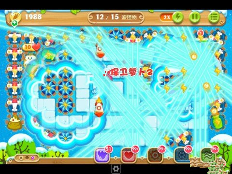 3、到了最后阶段,我们可以在左边位置上建造两个雪花炮塔用来减慢怪物 的移动速度,然后有钱就无限建造手电筒炮塔就可以通关啦,如下图所示,保卫萝卜2金萝卜100关布阵图就已经完成了。