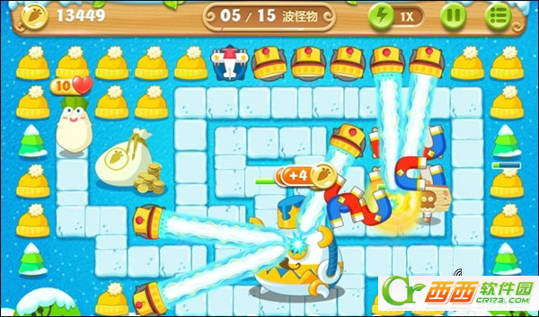 2、当我们将关卡中的道具都清理完成后我们可以在左上方位置上现建造几个雪花炮塔,并且升级至满级,然后在道路的旁边建满手电筒炮塔,有钱就依次将其升级至满级即可;