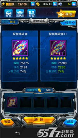 下面,就以爆破弹来举例子,下面图中左边是一个75级的爆破弹,现在升五星+1,亲们可以看到下面的材料说明: