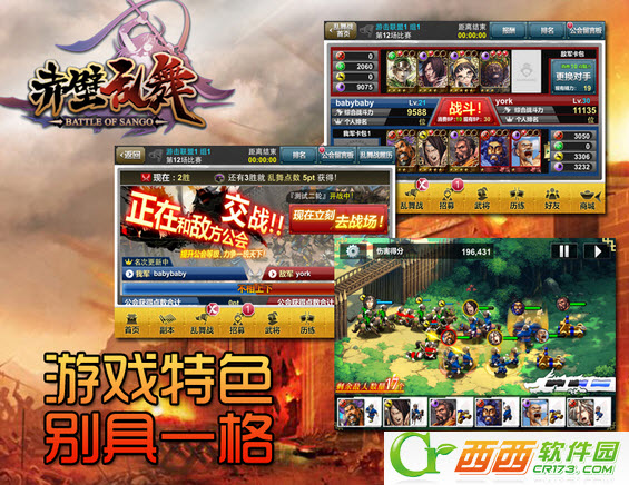《赤壁乱舞》中包含数百名武将上千枚卡牌,三国武将刘、关、张、、诸葛孔明等旷世名将应有尽有,堪称三国武将的“最强集合”;骑兵、步兵、弓兵、特殊兵等多元化搭配,做到了不同兵种不同特色,玩家需要针对敌人布阵迎敌取得胜利;丰富技能令战斗刺激异常,激发龙之气、激活武将潜力释放特殊技能,逆转战局;公会对战“乱舞战”模式,体验手游中的畅爽公会对决,集结伙伴大闹三国,获取丰厚奖励。