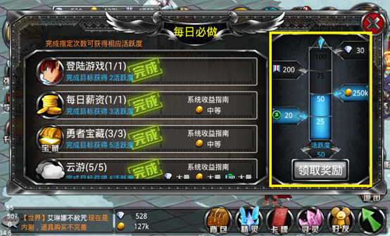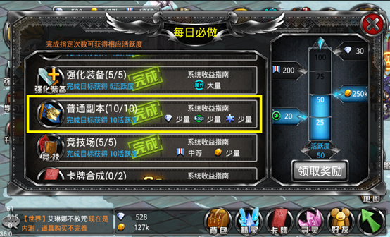 3、活跃度:游戏中有活跃度的系统,参加每日指定的活动可以提高当日的活跃度。当游戏活跃度达到100时,即可领取30钻石,记得每日必做中任务做完后,领取相应奖励。