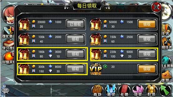 2、登陆礼包:前七天登陆游戏系统会有登陆礼包,其中第五天、第六天、第七天分别有10钻,20钻、30钻可领取,前七天登陆后千万不要错过。