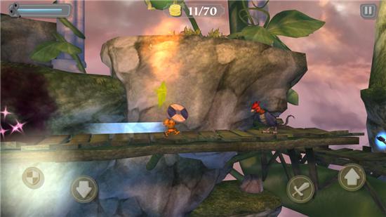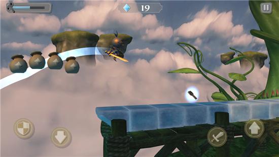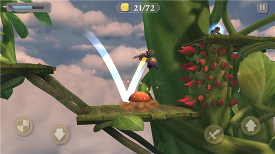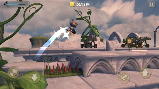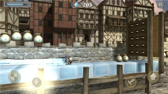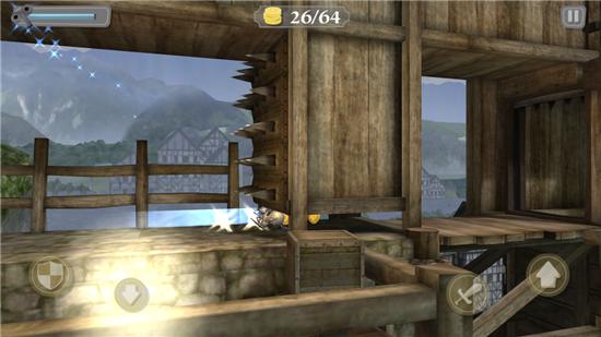 使用左手可以命令骑士小哥做出盾牌格挡和滚地两种动作,右手就更简单了,分别控制攻击和跳跃,玩家需要利用这四种行动来闯关。沿途你会遇到各种奇奇怪怪但是又非常有意思的障碍或陷阱,比如豌豆投石机、阁楼中下落的木桶都可以将你砸死,不用考虑了,立刻举起你的盾牌吧。“滚地”其实就是为了通过一些比较低矮的环境,玩法要领从本质来说和《神庙逃亡》系列是一致的,只是角度和操作上《发条骑士》系列更有新鲜感。