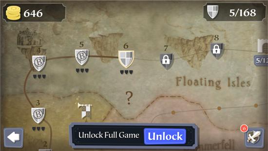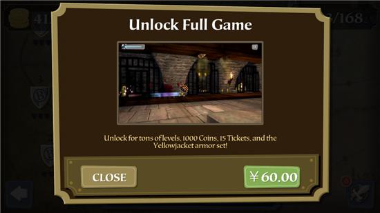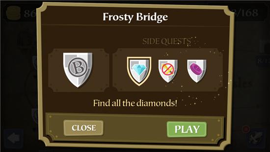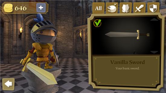 当每一关通过之后,回头再次挑战这一关卡时会看到额外提供了三个玩法内容,是收集钻石、躲避毒金币还是不使用攻击过关随你选择,每成功挑战一种任务就会获得一个盾牌奖励,攒齐若干数量可以解锁后续关卡。另外,平时我们收集来的金币主要用于购买新装备,比如头盔、武器、护甲什么的,当中会包含一些魔法效果和技能,售价嘛很感人就是了。