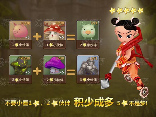 当你拥有两张同等星级等级都为30级强化+5的小伙伴时候,你就可以通过合成功能,合成后玩家将获得一张比原有星级+1的小伙伴卡片。