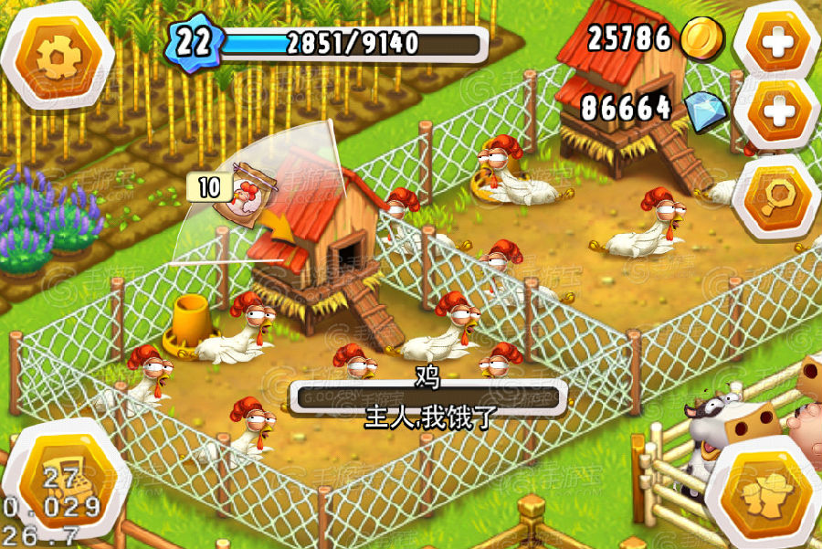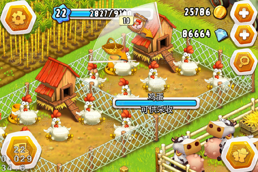饲养小鸡的操作也很简单。玩家点击无力哀嚎状的小鸡,同样左上角会出现喂养小鸡所需的饲料,点击饲料拖动到需要有需求的小鸡身上,小鸡立刻会满血复活,如果玩家饲料比较充足,可以点击选中饲料,然后滑动移至所有小鸡身上,一片的喂养!一只小鸡正常成长的时间是20分钟,玩家可以通过钻石进行秒速成长。小鸡长成熟后自动进入产蛋环节,收取鸡蛋的操作同很简单:点击大肚便便的小鸡,左上角出现篮子,点击选中篮子,拖动至所有可收取鸡蛋的小鸡身上,鸡蛋便会自动收取完成。