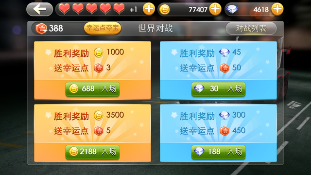 在天天飞车对战新模式下,按金币与钻石参加方式的不同以及数额划分为了4个板块,玩家选择其一后,系统将会为玩家自动搭配对手。