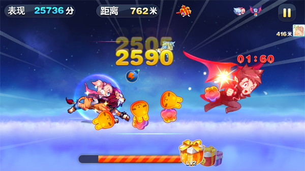 进击模式最大的变化就是原本熟悉的“下滑”按钮变成了“攻击”按钮,原先能够被踩扁的怪物也悉数变成了带刺怪物,需要主动发起攻击将其消灭,获得更多的分数。不过,按下“攻击”按钮需要让敌人先进入角色的攻击范围,系统将根据不同的攻击距离进行相应的分数判定,分为“普通攻击”、“Perfect”和“Great”三种,越靠近敌人攻击评价越高,其中“Perfect”判定的分数最高,需要玩家勤加练习,熟悉进攻节奏。新模式的另一大变化则是“超级奖励”变成了“BOSS奖励”,当玩家在进击模式奔跑屏幕下方进度条累积到100%时,可以直接面对久追不遇的小恶魔BOSS,并可利用投掷炸弹直接对它发起进攻。BOSS被炸弹击中时会不断掉落各种奖励,而且还不会还手,让它尽情感受你的愤怒吧!