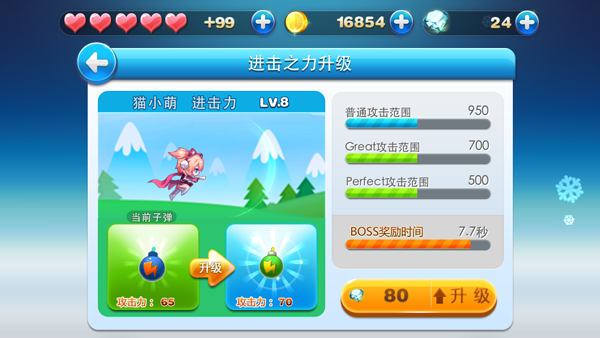 想要在进击模式下获得好成绩,首先还需要全面熟悉这一模式下的独特操作,小编刚开始接触进击模式时还老习惯使用跳跃躲避敌人,殊不知这样跑完一局下来分数低得可怜,所以必须重新习惯使用“攻击”按钮应对地图中出现的敌人。在进击模式下,角色们还增加了一个全新的属性面板,分别是进击力等级、攻击力、普通攻击范围、Great攻击范围、Perfect攻击范围和BOSS奖励时间。玩家需要消耗金币和钻石来提高进击力等级,其他属性便会相应提升。攻击力决定了BOSS奖励时对它造成伤害的高低,越高就能越快消灭BOSS;三大攻击范围分别代表着各个评定的攻击距离,举例来说,Perfect攻击范围越大,玩家在攻击敌人时的安全距离就越大,也更容易获得Perfect分数;而BOSS奖励时间则直接影响到进入BOSS奖励关卡的逗留时间。