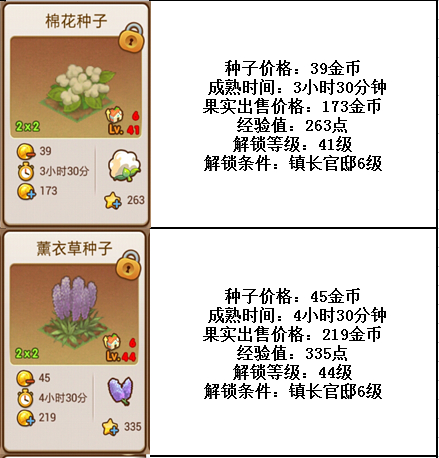 40级这个阶段,将可以解锁“棉花”和“薰衣草”。小编强烈建议玩家种植薰衣草,因为薰衣草小镇真的太美了。