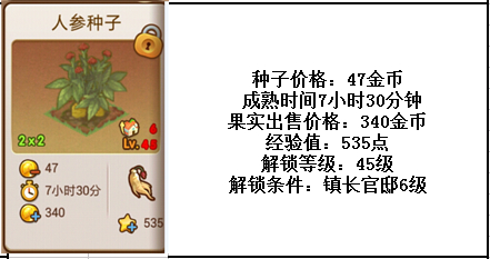 作为《全民小镇》的最后一个需要解锁的作物,“人参”是属于所有达到45级玩家的梦想作物。超长的成熟时间,超丰富的金币和经验奖励,每一样都是如此诱人!