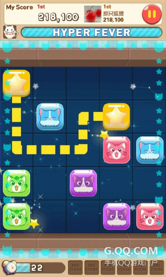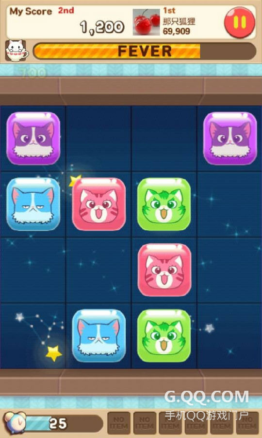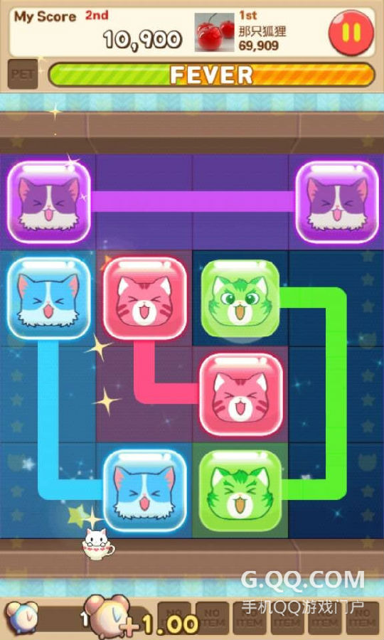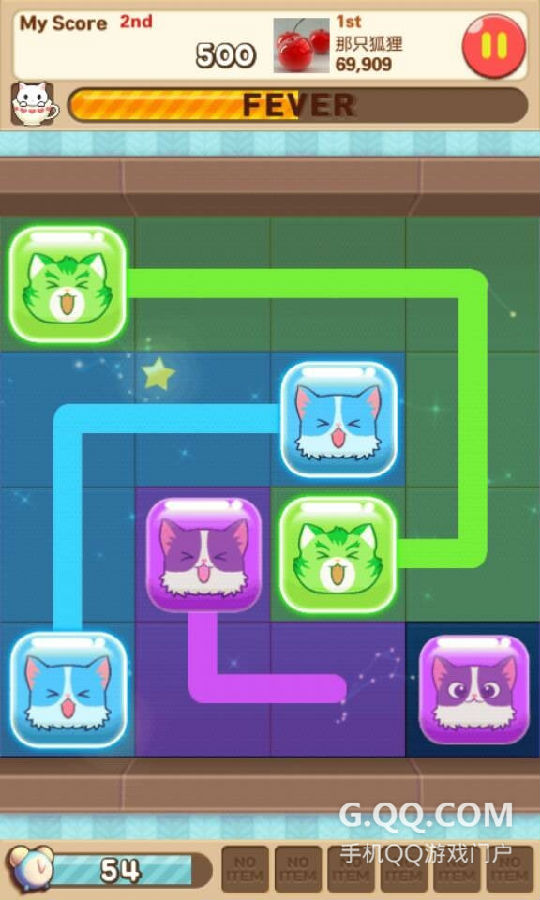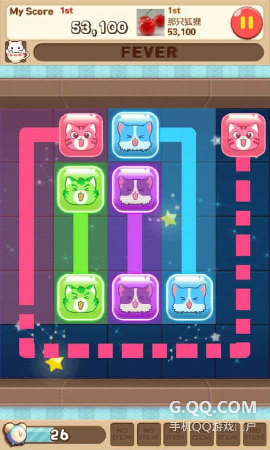 将颜色相同的猫图连在一起,所有相同颜色的喵喵连接起来才可以进入下一关,且连接图的线不能相交叉。链接所有的图案消除后就会得分,连续消灭会获得积分加成,上方的FEVER条会记录你的分数加成,