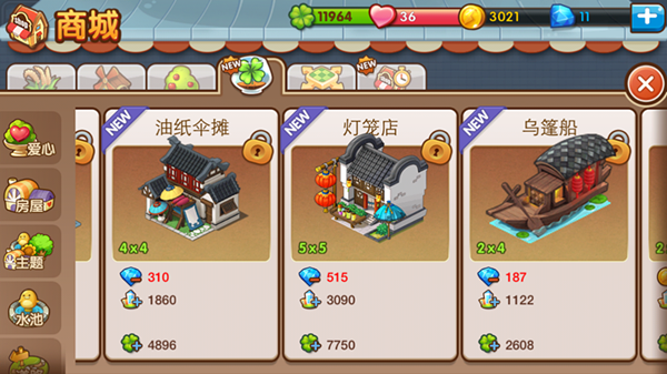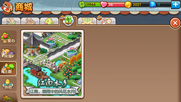 玩家只要在游戏中点击“商店”按钮,选择“四叶草”的页面,就能看到“主题”的选择项咯。每一个主题里都有《全民小镇》为您精心搭配的主题建筑和装饰,譬如“江南水乡”,里面不仅仅有江南味道的古老建筑,还包含了石亭、荷叶、水塘、老树、木船等等元素配件。玩家还能开放思维,搭配主题以外的装饰或建筑,手把手的打造出拥有具自我特色的江南水乡