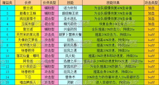 与控场技能相对的就是增益类的技能,这类技能主要是为我方队员增加正面buff,全体开挂,原地复活。这类技能又可分为加血类和buff类,总体来说属于游戏中非常稀有的技能;如果抽到了一定要好好珍惜!有了这个技能等于有个移动医务室,感觉有点犀利哦!