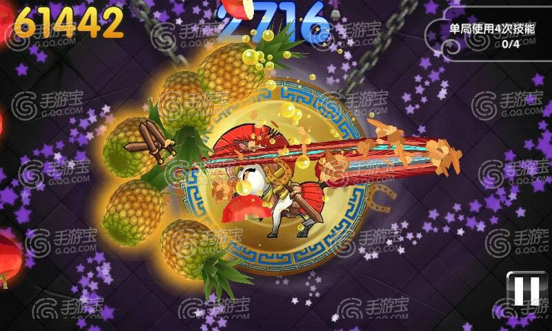游戏的玩法很简单,用你的手指在屏幕上移动,发现抛出的水果就看准划过去,就可以斩开水果了。注意水果有大有小,小的水果比较不容易斩到。另外还要注意的是除了被抛出的水果外,惩罚的炸弹也会出现,斩到炸弹会被缩减时间,甚至游戏就结束!