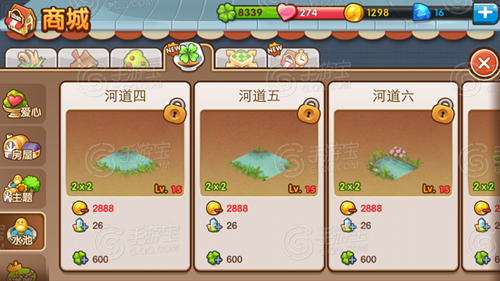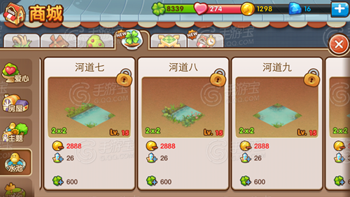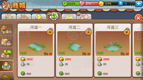 点击屏幕全民小镇右下角的商城按钮,然后选择第四个按钮,点击“水池”就可以看到河道了,河道占地面积2*2,需要2888金币,增加绿化度600,繁荣度26!点击之后就可以摆放在主界面上了,如果需要移动则点击“其他”,选择“移动”。