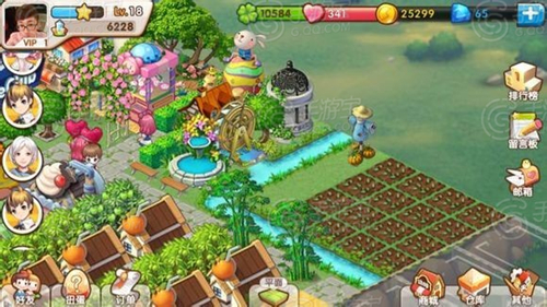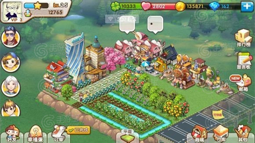 玩家可以通过这个界面编辑自己的小镇格局,增减移动各类建筑,收获生产完成的果实产品等。主界面的左上角为玩家信息,包括玩家等级及城市繁荣度等;而玩家信息下方则是小镇任务提示,小伙伴们可以通过点击角色头像查看任务以及完成情况。而主界面的右上方则是小镇/镇长的各项指(财)标(富),包括绿化度、爱心(用于扩地、购买建筑等,通过与好友互动获得)、金币、钻石。另外,玩家还可以通过主界面边上的各项选项查看相应的信息以及选择需要的功能。
