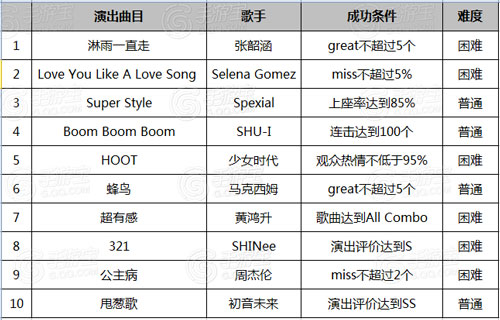 大家可以从表格中能够了解到“高级巡演”的曲目难度全部为困难,整个巡演难度为“高级”,通关要求比较高。下面我们就挑几首具有代表性的歌曲进行介绍吧。