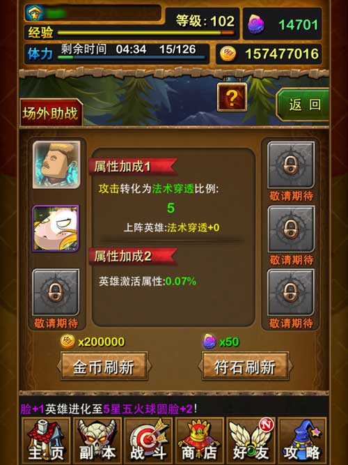 在以往《我叫MT》战斗中,玩家至多可以派出六名角色出场(其中包括一名好友和五名自培养英雄)。而在新版《我叫MT》内,玩家除了可以正常派遣上述六名角色参与战斗外,还可以额外派遣一名英雄在场外“助阵”。需要注意的是,“助阵”并非是让角色直接参与战斗,而是为已经入场的队员提供“法术穿透”、“免伤”等特殊效果!