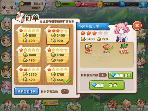 理由:首先高星级的奖励是非常可观的,然后每个人每天都会刷出6个订单,而每天每个人却只能免费刷新一个订单。所以优先完成高星级的订单,会使那个订单自动刷新。直到全部订单都剩下低星级的时候,才显得这一次免费刷新订单的重要性了。当然,RMB玩家请无视这点。