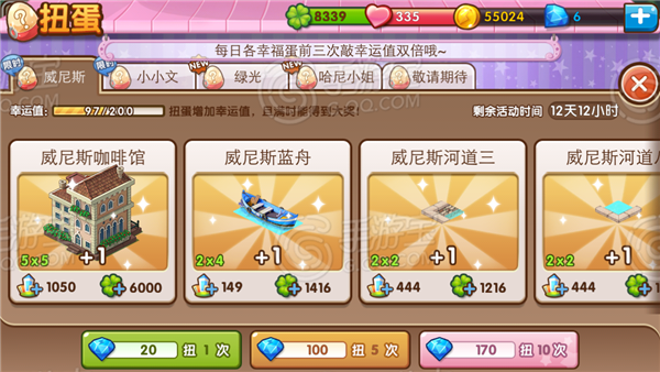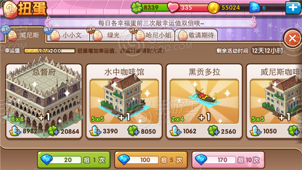 在五一期间,新一期的扭蛋活动也会如期更新。这个时候我们将可以在“威尼斯”的专属扭蛋专区,只要花费20钻,就可以抽取所有水城威尼斯的全新建筑配件了,只要你有足够好的运气,“总督府”大奖说不定就砸到你头上囖。极具意大利建筑风格的“威尼斯总督府”恢弘庞大,不仅仅能增加你上万点的繁荣度,还能增加高达20000点的绿化度。还有带有意式情调的“水中咖啡屋”,乘着“黑贡拉多”去喝威尼斯咖啡,是不是很有范呢?