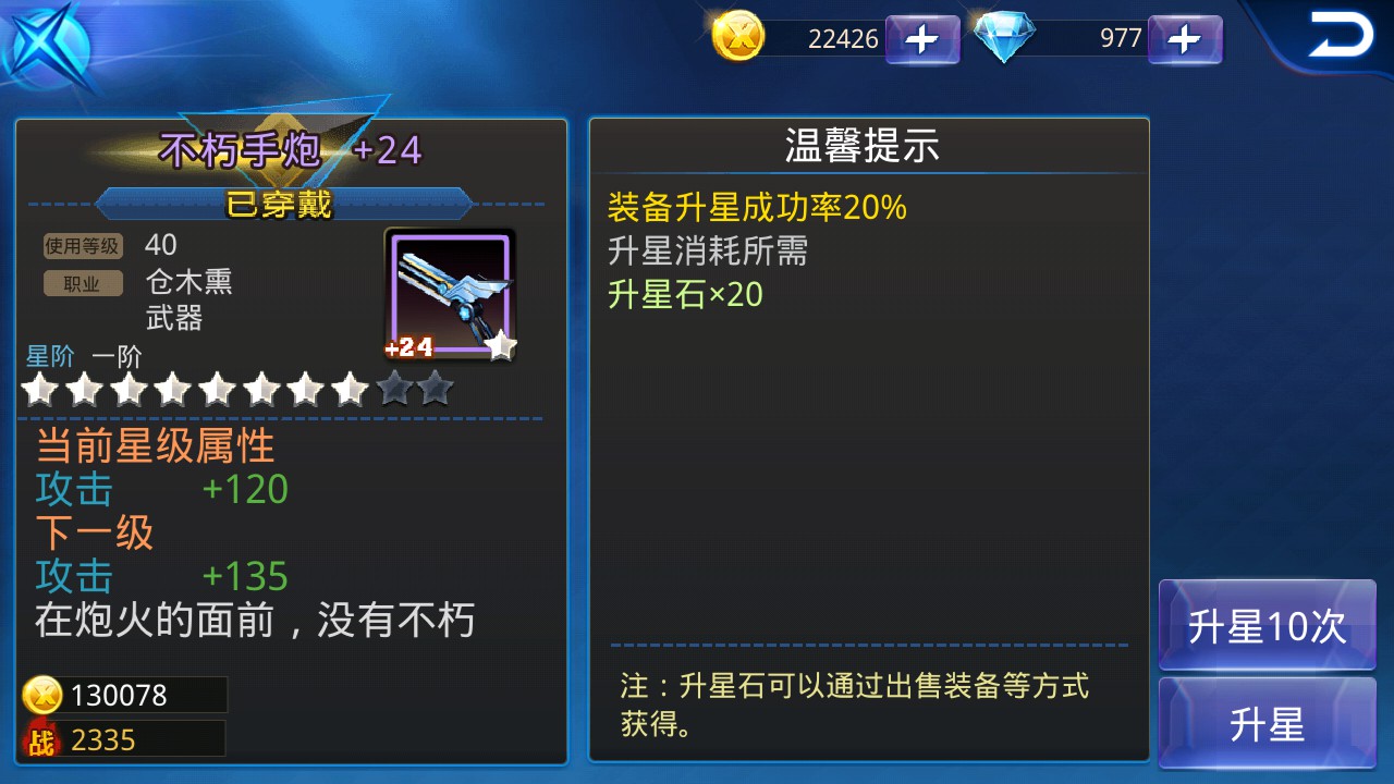 三,装备升星。这个也是快速提升战力的一个方法。但是必须是三十级以上的紫色或者是橙色的装备才能进行升星。