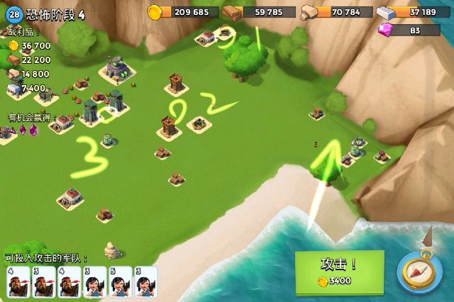 炸掉叉叉处双加农,野人登陆,打掉几个补给后信号弹打圈1,途中在圈2扔震爆,到达大本后治疗震爆自由使用。